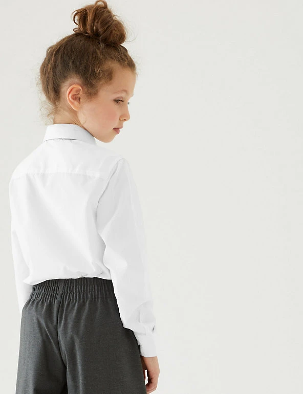Featuring an easy-to iron finish, these long sleeve shirts look crisp after just a quick press – perfect when you’re in a morning rush. Pack of three, designed in a classic fit and available in a longer length for taller children. For sizes below 8 years elasticated expandable cuffs help make independent dressing quicker and simpler. We are transitioning the polyester in this garment to recycled polyester. While we transition, customers may receive items made with either sustainable sourced cotton and recycled polyester or just sustainable sourced cotton and polyester.