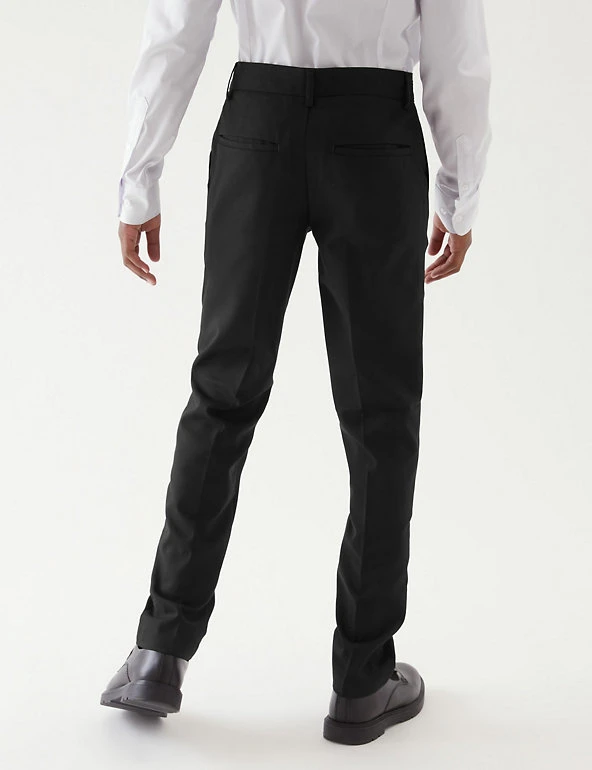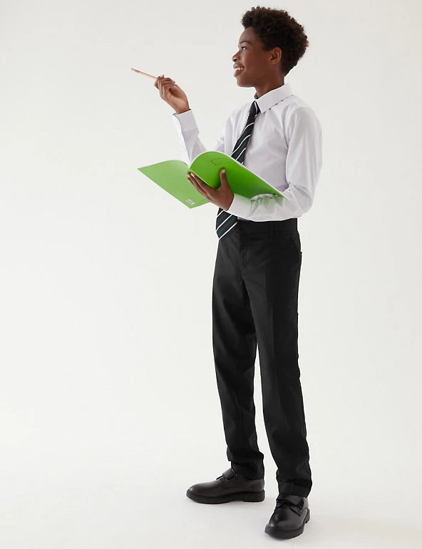 Slim fit, Trouser Style: Flat front, Elastic back waistband with zip and hook and bar fastening for- 6-10 years, Flat waistband with zip and hook and bar fastening for-10-11+, Stain & weatherproof: a durable finish that repels water and stains , Our crease resistant technology stops clothes from creasing during wear, and ensures creases fall out more easily