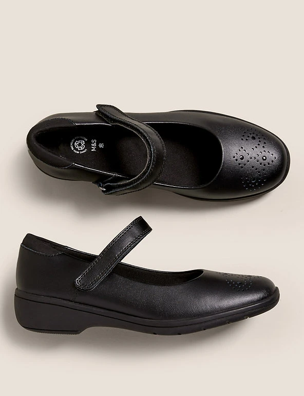 These durable leather school shoes are designed in a classic Mary Jane style, made with comfort in mind. Round toe design, with a quick and easy riptape strap and subtle floral detailing. A squidgy foam insole and soft collar padding keep feet comfy all day. Featuring low wedge heels with non-marking soles to protect your floors. Our antibacterial, odour-combatting Freshfeet™ technology keeps feet fresh. These shoes are complete with a recycled lining and sock, plus a scuff-resistant coating to keep them looking newer for longer. Made with sustainably sourced leather.