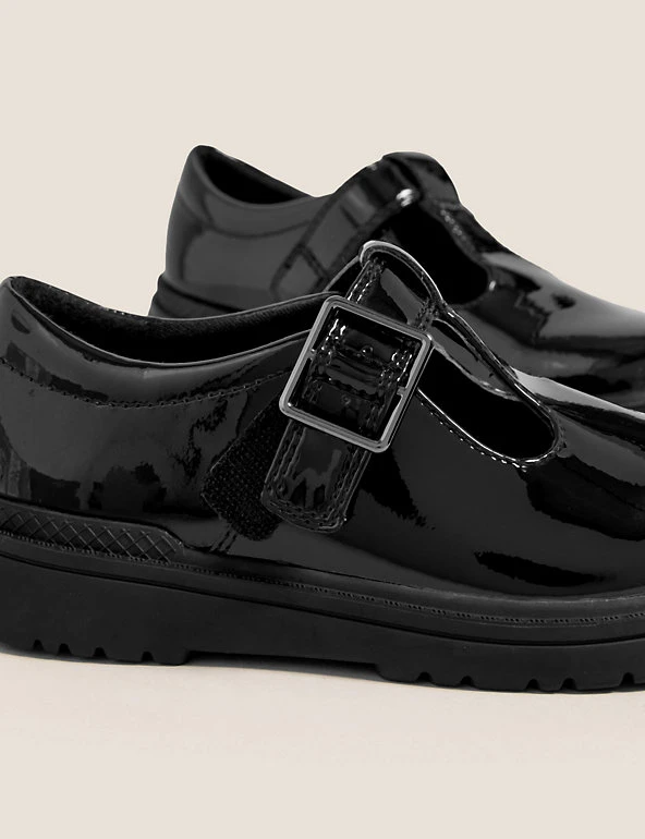 These sturdy patent leather shoes are ideal for school. T-bar style, with an easy riptape fastening. Antibacterial Freshfeetâ„¢ technology keeps their feet fresh. Squidgy foam insoles and soft padding to the collar for ultimate comfort. Handy scuff-resistant finish and non-marking soles for indoor floors. Made with sustainably sourced leather.