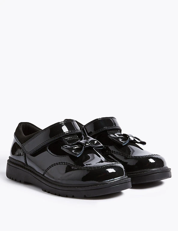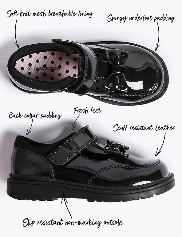 Opt for long-lasting children’s footwear with a sleek style that they’re sure to love with these kids’ school shoes. A simple T-bar fastening makes it easy for active kids to slip these on and off as they’re dashing in and out of the house, while a shiny finish and a bow detail add a nice touch to these children’s school shoes. These school shoes are fitted with our antibacterial technology to ward off odours and a scuff resistant finish for durability along with non marking slip resistant soles.