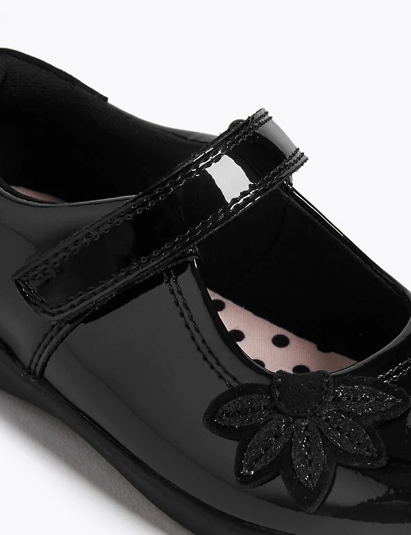 These sweet but sturdy patent leather shoes will help kids shine all day long. Available in multiple widths with a convenient and adjustable riptape fastening strap. Glittery floral detailing on the toe. Antibacterial finish to keep even the most active little feet fresh. Foam padding to keep them comfy.