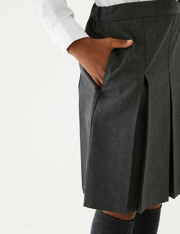 Neat, smart and classic school style is easy to add to any school uniform with our slim fit school skirt. Stain and Weatherproof finish repels water and stains and Crease Resistant material helps creases fall out easily. With Permanent Pleat technology to make sure pleats stay put wash after wash. This slim fit skirt sits closer and has an adjustable waist for perfect fit. Made with recycled polyester and sustainable viscose.